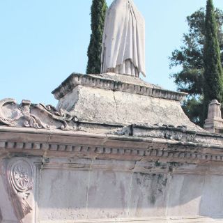 GUADALAJARA, JALISCO (13/OCT/2013).- La calle de Dolores de Jerez, donde curiosamente hace cerrada la calle Reposo, se encuentra el admirable Panteón de Dolores. Sitio de reposo final, frontera ineludible, donde la expresión arquitectónica se manifestó con riqueza de detalles, algunos originales. De la Capilla del Diezmo. Caminamos la calle Independencia con sentido sur y a dos cuadras giramos a la derecha por la calle del Panteón, al terminar la calle nos cautivo la Capilla de Dolores, su puerta en arco de medio punto, con la Virgen de Dolores en su clave, animada por palmas, el vano fue enmarcado por medias columnas toscanas. Sobre la cornisa, la ventana coral, vertical y con una almena por costado, arriba, un elaborado nicho enconchado, con la Santa Cruz, volutas en su inicio, columnillas corintias sostienen una labrada cornisa con ángeles. Por remate una cruz de cantera entre almenas. Del lado derecho se levantó el campanario, de un sólo cuerpo y de planta cuadrada, con un vano arqueado por cara y cubierto por cúpula.
