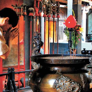 Con el pago cubrimos ocho horas, así que empezamos por el templo Tianhou, el más antiguo de Taiwán, construido en 1592. Los habitantes llevan sus ofrendas a Matsu, diosa de las aguas. Antes de orar encienden varitas de incienso, hacen una reverencia llevándose unidas las manos a la frente.