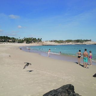 Después de apreciar la playa, percibimos su fresca agua y chapoteamos un inolvidable rato. Un catamarán, “Cabo Escape” y un galeón de tres mástiles, “Buccaneer Queen”, fondeaban en la playa, ambos traían a turistas a disfrutar la playa, un área estaba acordonada para nadar. Aparte ofrecen observar ballenas, tours de buceo libre y tours de puesta de sol.