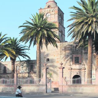 Barbicanas de cantera rosa, columnas cuadradas con elaborada almena y rejas blancas, resaltan la belleza del centro de este poblado