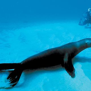 La fuga se debe a que un lobo marino los asecha. Sí, en estas aguas también es posible convivir con grandes especies como el tiburón martillo y el tiburón ballena, la ballena gris y las mantarrayas gigantes.