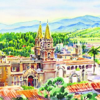 La postal más popular la ciudad apodada “La Perla Escondida”, como lo puedes ver en la acuarela que acompaña a estas palabras, es la Basílica de Nuestra Señora del Rosario, una monumental obra de cantera y también, una de la capitales “marianas” para todos los creyentes. Y es que la ciudad le debe buena parte de su fama a la Virgen del Rosario y su santuario, construido con maestría en cantera gris y cuyo interior cuenta con una planta en cruz latina.