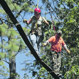 El camino es angosto, y poco a poco se empiezan a apreciar los cables de las tirolesas, puentes colgantes y otros paraderos en las copas de los altos árboles que decoran el parque en las más de 20 hectáreas que comprenden el predio mejor conocido como El Tlacuache.