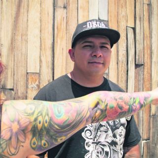 El Indio habla luego de terminar de perpetuar un brazo en tinta negra. Su mirada fija en el interlocutor intimida, así como el corazón tatuado en su garganta que palpita cada que emite una palabra.