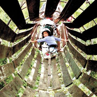 Aún nos faltan cuatro puentes más, pero el que sigue es redondo y hay que cruzarlo a gatas. Éste nos conduce a la penúltima tirolesa. Alrededor de 40 minutos nos ha tomado completar el circuito.