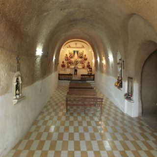 “Sí, está abierto”, grita don Juan Navarro, un hombre mayor, con el pelo entre cano, huaraches viejos y una camisa a cuadros amarrada con un pequeño nudo a la altura de su ombligo. Es el propietario de la iglesia, construida en 1939 por su padre, Jesús Navarro, excavadores de oficio que tuvieron a bien crear esta obra. “Sí, es un templo de arena señor; de pura arena, hecho a pico y pala por nosotros”, explica don Juan mientras abre la primera puerta, la del atrio. Apenas se pone un pie dentro del templo, lo primero que se aprecia es un frío extraño; húmedo, cual si fuere un congelador gigante. Don Juan enciende las luces, y lo mejor está por venir. Sí, es un templo formador en una cueva de pura arena, cavada a mano con picos y palas por la familia Navarro. De unos 30 metros de largo, donde al final se aprecia una imagen de la Virgen de Lourdes, a quien se venera ahí. Por donde se mire, todo es arena, pero sólida; firme.