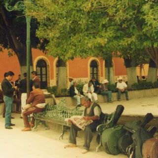 Ocupamos una banca del costado Sureste, esquina donde se reúnen diariamente varios mariachis para esperar ser contratados, entre tanto platican de los aconteceres recientes o practican algunas canciones, tuvimos la dicha de escuchar unas, entre ellas, una de un extraordinario y sensible compositor, y cantante a la vez, que finalizó con la siguiente estrofa: