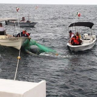 GUADALAJARA, JALISCO (10/ENE/2012).- Un grupo de amigos tapatíos que gustan de la pesca deportiva, vieron transformada su tranquila jornada en una faena para liberar a una ballena que se había atorado entre redesposiblemente ilegales en aguas del Océano Pacífico.