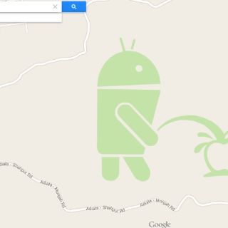 GUADALAJARA, JALISCO (24/ABR/2015).- Por razones desconocidas, al navegar por una ubicación de la ciudad de Rawalpindi, en Pakistán, utilizando Google Maps se mostraba una figura del robot de Android orinando sobre el logotipo de Apple.