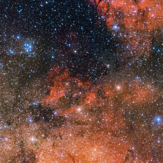 Esta imagen de 615 megapíxeles captada por este telescopio instalado en el Observatorio Paranal, en Chile, y difundida hoy por el ESO desde su sede central en la ciudad alemana de Garching, muestra un puñado de llamativas estrellas azules y nubes rojas de hidrógeno ionizado brillante y oscuros filamentos de polvo.