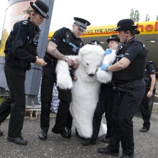 LONDRES, INGLATERRA (16/JUL/2012).- La policía británica detuvo hoy en Edimburgo a cinco activistas de Greenpeace que se habían encadenado a una gasolinera de Shell para protestar por las perforaciones en busca de crudo que esa empresa está a punto de iniciar en el Océano Ártico.