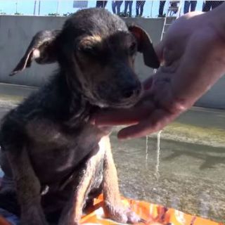 El can se encontraba en medio de un canal de aguas pluviales en Los Ángeles, California. El cachorro había sido mutilado de una de sus patas traseras, tenía sarna, una fuerte infección en los ojos, hipotermia y se encontraba desnutrido.
