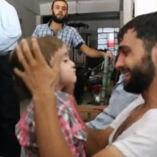Los presentes, toman al niño para ayudar a que su padre logre reincorporarse. Entre lágrimas y un poco más calmado, el padre sostiene a su hijo, lo abraza y besa, conmoviendo a los presentes que al igual que él daban por muerto al pequeño en el pasado supuesto ataque químico en Siria.