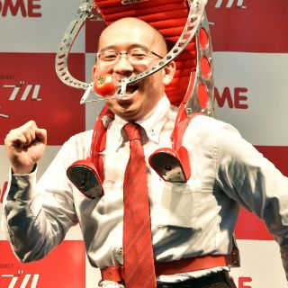El "Tomachan" es un distribuidor de tomates en forma de robot que se puede poner en la espalda como si fuera una mochila y pesa ocho kilos.