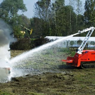 El vehículo robot lanza agua y espuma, rompe obstáculos, levanta pesos de hasta dos toneladas, puede despejar obstáculos de hasta 10 toneladas y puede ser dirigido por control remoto desde una distancia de mil 500 metros, según el fabricante, la compañía Dok-ing.