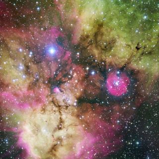 Según el Observatorio Europeo Austral ( ESO), la imagen recuerda a un fantasma de colores. Algunas de estas jóvenes estrellas se han originado a partir de las densas nubles brillan intensamente aunque otras permanecen escondidas.