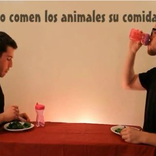 En menos de un minuto y medio, dos jóvenes intentan ejemplificar cómo comen los animales.
