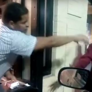 Sin embargo, al momento que el hombre se acerca a la ventanilla, es recibido con un vaso de agua directo a la cara así como burlas e insultos por parte del empleado.