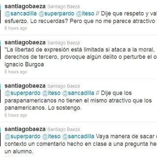 El comentario subió a la red de Twitter y la reacción de repudio fue tan amplia e inmediata, que en el mismo sitio, por medio de su dirección @ITESO, la institución educativa expone: “Como Universidad incluyente, el ITESO manifiesta su rechazo a cualquier forma de discriminación. Sobre el comentario atribuido al profesor Santiago Baeza, respecto de los atletas parapanamericanos, el maestro ha explicado que sus palabras fueron descontextualizadas. Las autoridades académicas estarán atendiendo educativamente esta situación con el profesor y los alumnos. Reiteramos nuestro total respeto a todas las personas con capacidades diferentes”.