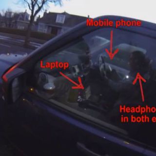 GUADALAJARA, JALISCO (09/FEB/2015).- Un ciclista de Aberdeen, en el Reino Unido, logró captar en video a un conductor que a la vez que maneja, está usando su celular, mientras que al lado suyo tiene su laptop abierta y prendida, y además está usando audífonos en ambos oídos.