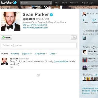 Con tan sólo un tweet, la cuenta de Sean Parker ya se encuentra verificada y hasta el momento cuanta con cerca de 25 mil 390 seguidores. En su perfil se lee el nombre de los sitios que ayudó a crear, como Napster, Facebook, Causes y Airtime.
