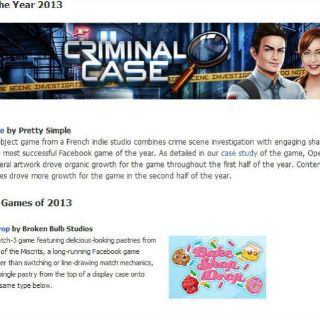 - ''Salón de la fama'', con aquellos juegos que se lanzaron antes de 2013 pero que siguieron arrasando en este año, tales como ''Candy crush'', ''Farmville'' y ''Double down casino'', entre otros.