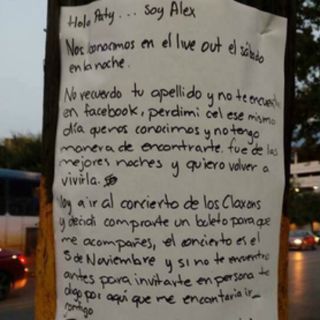 En la letra de la canción, hace referencia a la frase “tengo dos boletos por si quieres ir al concierto”, que el supuesto Alex escribió en una cartulina, dirigido a una joven llamada Paty, a quien decía haber conocido en una presentación de varios grupos musicales en el Parque Fundidora, donde pasó una de sus mejores noches; pero no podía contactarla en Facebook, porque olvidó su apellido.