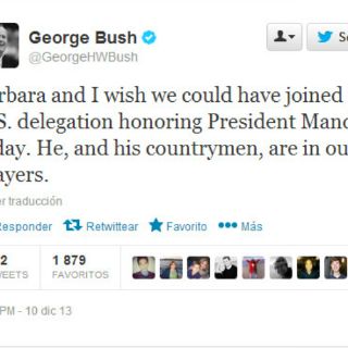 "Barbara y yo desearíamos haber podido unirnos a la delegación estadounidense que honró al presidente Mandela hoy. Él y sus compatriotas están en nuestras oraciones", escribió Bush en su primer tuit en la cuenta @GeorgeHWBush.
