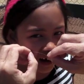 El diente de la pequeña es atado a una pelota, mediante un hilo, que luego es golpeada por su hermano mayor