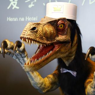 El robot recepcionista que habla inglés tiene la apariencia de un dinosaurio y el que habla japonés semeja una humanoide con pestañas. "Si quiere registrarse, presione el uno", dice el dinosaurio. El cliente aprieta un botón sobre el mostrador y anota su información en una pantalla.
