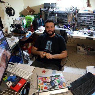 Desarrolla sus gadgets con la creatividad que tiene a cuestas. Por ejemplo, tiene tres drones. Pero casi media sala de su departamento es un taller de gadgets. Herramientas, aditamentos mecánicos y electrónicos cubren un gran escritorio junto a pinzas, alambres y circuitos; el aparente caos en su casa es el estado en que más cómodo se siente. Resalta una impresora de tres dimensiones, con la cual diseña piezas de plástico que utiliza para sus drones. Una computadora de escritorio y dos personales rematan su “taller”. Su equipo lo complementa con un smartphone que quiere modernizar.