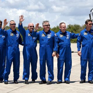 Los seis, vestidos de azul con las insignias de la que será la última misión del Endeavour, se tomaron la foto de rigor antes de comenzar a revisar por última vez los procedimientos del lanzamiento.
