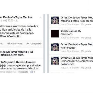 Ayer viernes poco después de las 22:00, el maestro Omar de Jesús Téyer Medina, quien labora para varias universidades privadas de Mérida, comentó en su muro lo siguiente: "Voy a reprobar a mis alumnos si descubro que alguno hizo la ridiculez de ir a la manifestación/protesta por Ayotnizapa #PobredeEllos #Cuidadito".
