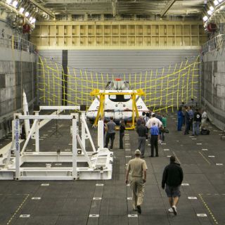 Cuadrillas practicaron el arrastre de una nave espacial simulada hacia la popa del USS Anchorage.