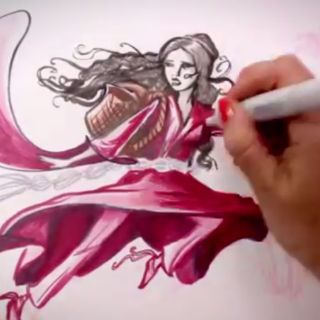 Aparentemente, dichas líneas no dicen nada, pero Mary toma aquel garabato y comienza a trabajarlo con otros plumones de colores logrando que poco a poco tome forma de una chica con un kimono, pero este ejercicio forma parte de una gran galería que la joven muestra a través de sus cuentas de redes sociales.