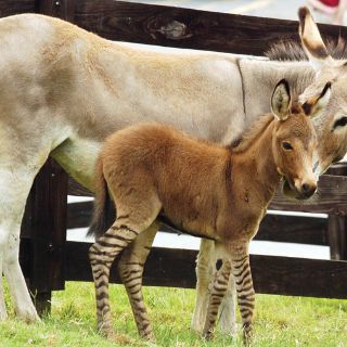 El animal, nacido de una cebra macho y un burro hembra, tiene rayas negras en lugares muy visibles en las patas y parte del frente de la cabeza.