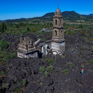volcán más joven del mundo y que el próximo mes cumple 73 años, sepultó dos pueblos mexicanos al surgir de las entrañas de la Tierra pero la mitad de una iglesia sobrevivió, convirtiendo el sitio en una intrigante belleza natural.