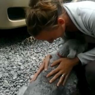 Cuando se volvieron a encontrar, el perro se acercó a ella y empezó a llorar muy fuerte, mientras ella se sentó en el piso para acariciarlo; tanta fue la emoción del can que parece desmayarse.