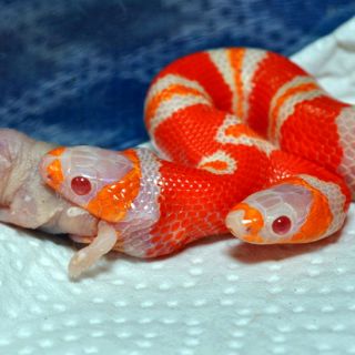 Rara serpiente albina de dos cabezas engulle su primera comida