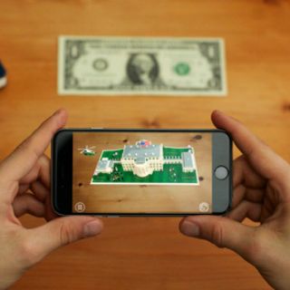 La app abre la cámara del equipo y debes enfocarle sobre el billete, para que te muestre la animación tridimensional de una de las casas más famosas del mundo.
