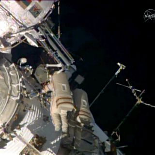 De acuerdo con el plan de trabajo, los dos cosmonautas desinstalarán dos antenas, que será desechadas y tomarán fotografías del casco de la EEI.