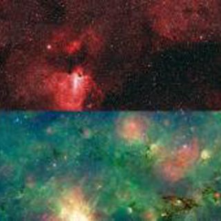 El azul representa la luz de 3.6 micrones y el verde muestra la luz de 8 micrones, ambos capturados por el conjunto de cámaras infrarrojas de Spitzer.