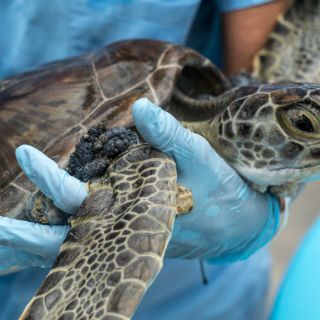 La tortuga marina verde, un ejemplar de dos años de edad de esta especie en peligro de extinción, está infectada con fibropapilomatosis, una enfermedad potencialmente mortal causada por un tipo de herpes.