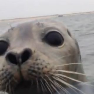 La foca logra trepar hasta quedar encima de uno de ellos, hecho que en redes sociales han calificado como "un acto de nobleza que demostró la sana convivencia entre seres humanos y animales."