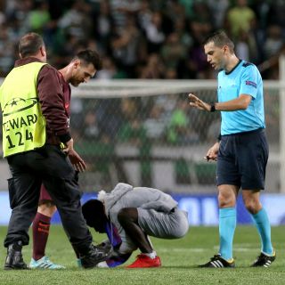 A pesar de que el Barcelona no dio su mejor demostración de futbol hoy ante el Sporting de Portugal, eso no impidió que un aficionado saltara a la cancha para abrazar a Lionel Messi y besar sus botines.