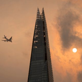 Un avión pasa por el edificio Shard en Londres. La oficina meteorológica del Reino Unido dijo que se deben tanto al polvo procedente del Sahara que ha arrastrado "Ofelia" como a partículas de los incendios en Portugal y España. AP/D. Lipinski