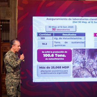 "En el mes de junio, (se ha decomisado) fentanilo tres kilogramos, mil 726 kilogramos en el año y en total siete mil 564 kilogramos. Metanfetaminas: 129 kilogramos en este mes, en lo que va el año 134 mil y en lo que va del sexenio 291 mil kilogramos", informó.