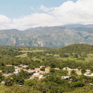 La calle se estrecha en la última curva antes de llegar... dejando ver al dar la vuelta, el horizonte marcado por las siluetas de los riscos de la barranca y, en un primer plano, un caserío medio camuflado por las copas de los árboles y las huertas de mango y ciruela amarilla que llenarán de olores el pueblo justo antes de que empiece a llover y dé inicio la cosecha.