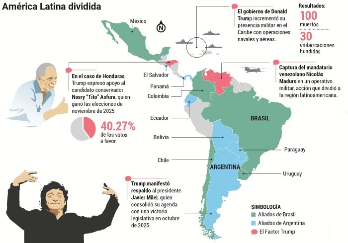 Mientras que, en el caso de Honduras, Trump expresó apoyo al candidato conservador Nasry “Tito” Asfura, quien ganó las elecciones de noviembre de 2025 en un resultado estrecho reconocido por el Consejo Nacional Electoral. La presidenta Xiomara Castro denunció la injerencia estadounidense en la campaña.