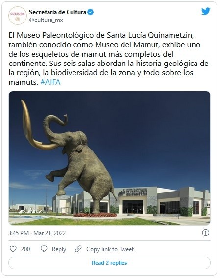 El Museo Paleontológico de Santa Lucía ‘Quinametzin’, recinto único en su tipo ubicado en el pabellón cultural del Aeropuerto Internacional Felipe Ángeles (AIFA), en el Estado de México, se encuentra listo para recibir visitantes junto con su centro de investigación aledaño, como resultado de la colaboración entre la Secretaría de la Defensa Nacional y la Secretaría de Cultura, a través del Instituto Nacional de Antropología e Historia (INAH).Estas instalaciones se plantean como un enclave nacional e internacional para el estudio de la paleontología y se abrirá al público de martes a domingo de 10:00 a 16:00 horas; cuenta con seis salas de exposición permanente, una sala para muestras temporales, un jardín temático, salas de interacción digital y de proyecciones en 4K, áreas para talleres infantiles y servicios como cafetería, juegos infantiles y tienda de recuerdos.El guion científico, creado por investigadores del INAH, de la Escuela Nacional de Antropología e Historia (ENAH) y de la Universidad Nacional Autónoma de México (UNAM), especializados en paleontología, arqueología y otras ciencias, y complementado por personal de la Coordinación Nacional de Museos y Exposiciones del instituto para incluir espacios aptos para personas con discapacidades visuales y auditivas, presenta en la primera sala permanente la historia geológica de la Cuenca de México en los últimos 30 millones de años; la segunda sala, se dedica al mamut colombino (Mammuthus columbi), gracias a uno de los esqueletos más completos –con el 96 por ciento de sus restos óseos– recuperados durante el trabajo de salvamento arqueológico en el aeropuerto.La sala tres brinda un panorama sobre el registro fósil de la Cuenca de México, mostrando qué organismos de flora y fauna habitaron dicha región –comprendida entre la Ciudad de México, el Estado de México e Hidalgo– hace más de 10 mil años; en la sala cuatro se muestran reproducciones de cráneos humanos y materiales culturales que permiten reconstruir la historia del poblamiento paulatino de la zona.La sala cinco toca la relación entre los fósiles y cómo han sido percibidos en épocas pasadas o incluso en la actualidad, lo que se relaciona con el nombre del museo pues “Quinametzin” es un vocablo náhuatl que significa “gigante”, en alusión a la idea de que los vestigios de megafauna eran huesos de gigantes que poblaron la Tierra en la antigüedad.La última sala ofrece una síntesis de los trabajos de salvamento realizados en el AIFA, los se plantea prosigan pues el diseño de la terminal contempló áreas de reserva para exploraciones futuras; ahora, se cuenta también con un Jardín Temático, donde las y los visitantes podrán, por medio de proyecciones en 360 grados de elementos visuales y auditivos, apreciar el paisaje y el ambiente de hace 15 mil años.El museo incluye un Centro de Investigación Paleontológica, espacio que resguardará e investigará los restos fósiles y la información asociada que se han recuperado en el AIFA, tiene una superficie de dos mil 600 metros cuadrados y cuenta con laboratorios, área de restauración-conservación y una osteoteca que resguarda ya más de 62 mil piezas óseas de los salvamentos arqueológicos.El centro está equipado con 37 módulos de anaqueles móviles para optimizar espacios, 191 módulos de anaqueles fijos para piezas de formato menor y una grúa móvil para la manipulación de piezas de gran formato, con capacidad de carga de dos toneladas; además de sistemas de climatización y control de humedad.En este centro se dará continuidad al análisis de los numerosos vestigios arqueológicos que se han descubierto en los casi 600 puntos de exploración, ubicados en los terrenos del AIFA desde el 5 de noviembre de 2019 y hasta hoy.JM